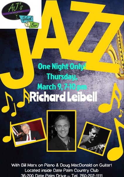 Richard Leibell (guest singing artist) at AJ's On The Green with Bill Marx(piano) and Doug MacDonald(guitar) March 9,2017, 7-10pm.Singing selections from "The Great American Songbook" Date Palm Country Club,Cathedral City,Ca.